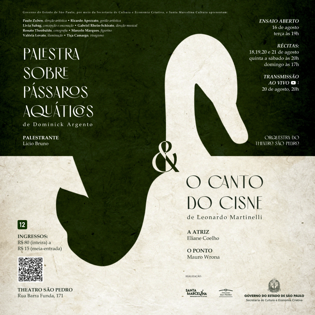 Tem estreia nova chegando no Theatro São Pedro! No dia 18 de agosto abrimos as cortinas! Venha para a curtíssima temporada da dobradinha de óperas: O Canto do Cisne e Palestra sobre Pássaros Aquáticos.